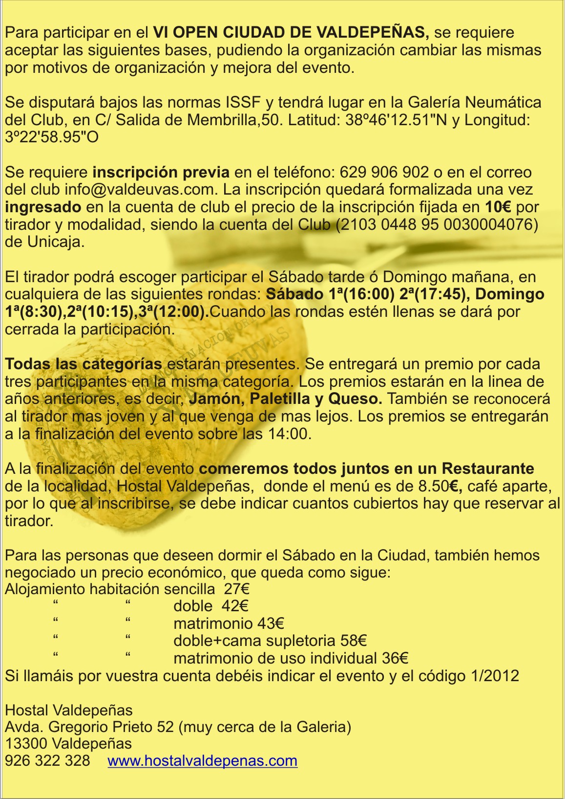 Al igual que en pasadas ocasiones, el sábado 17 y domingo 18 de Marzo, se celebrará el VI Open Ciudad de Valdepeñas organizado por el Club Valdeuvas. Aquí tenéis el cartel y las bases del open. Para poder asistir tenéis que realizar por adelantado el ingreso por la tirada, tenéis más información en la web del Club Valdeuvas. ¡Nos vemos en la galería!