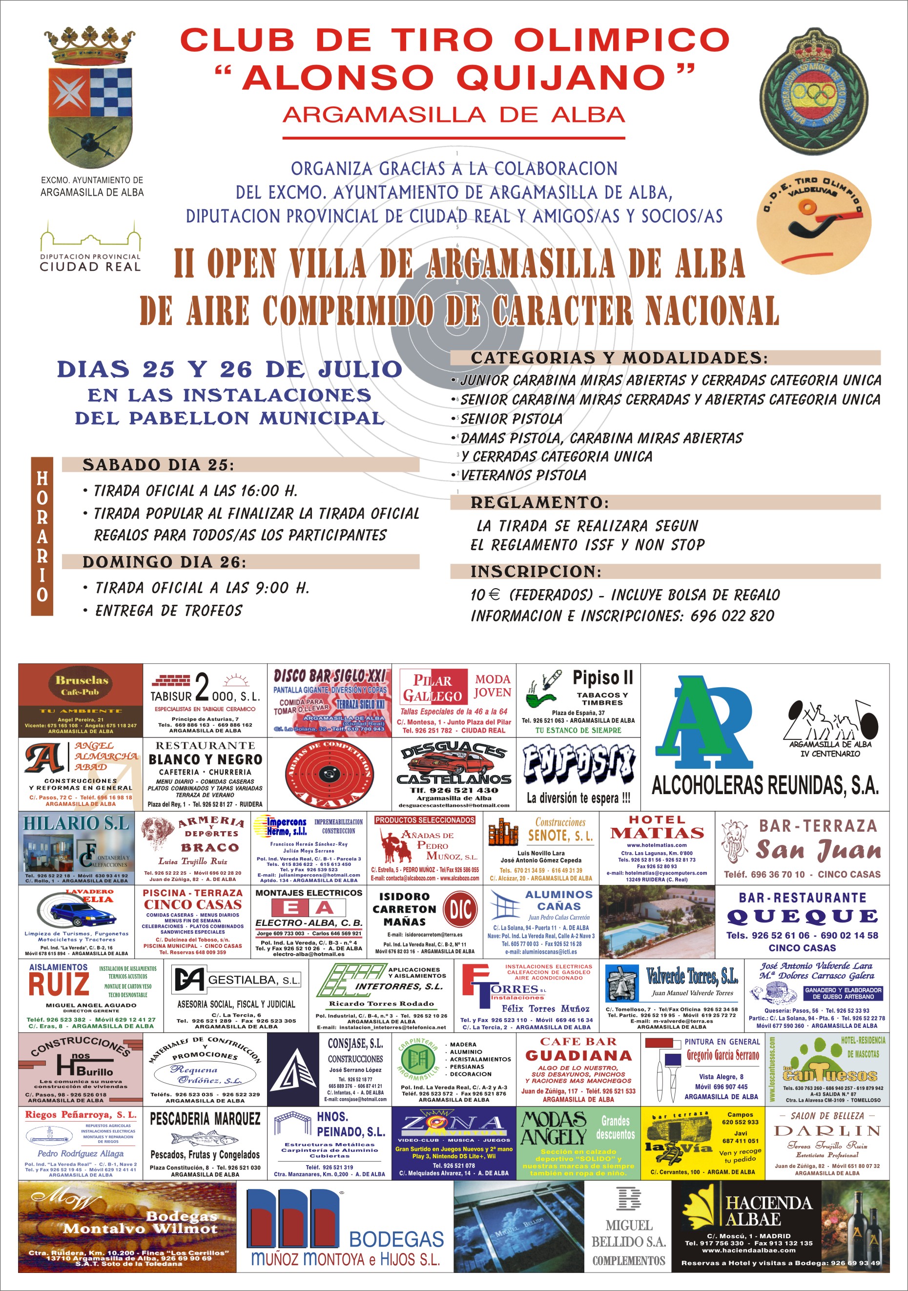 El sábado 25 la tirada oficial comienza a las 16:00, tras la cual se realizará una tirada popular. El domingo 26, tras la entrega de trofeo, los participantes están invitados a comer. Tenéis más detalles sobre la tirada en la carta de invitación. Tal y como pone en el cartel, para obtener más información podéis llamar al teléfono 696 022 820.