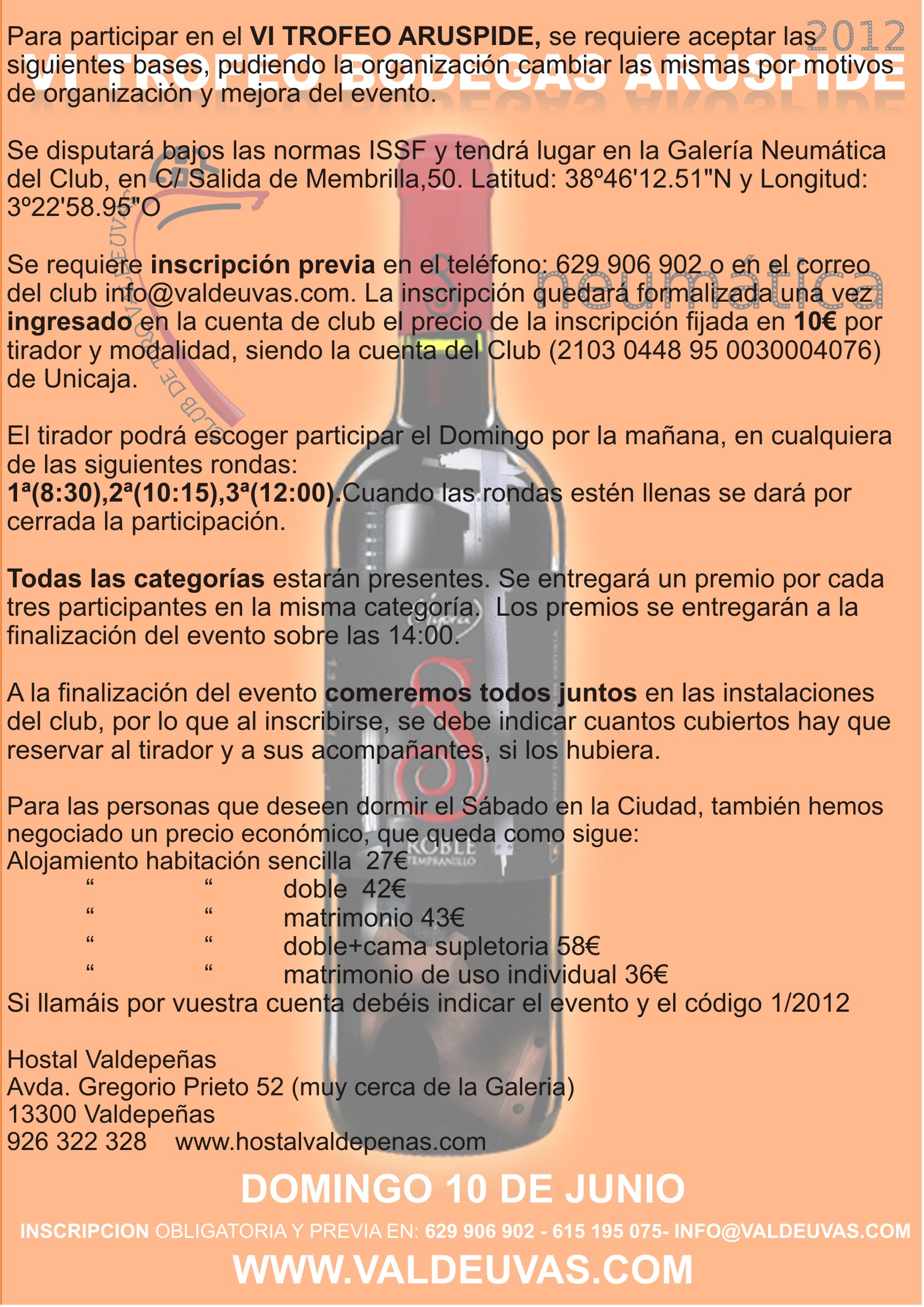 Aquí tenéis el cartel del trofeo y las bases del mismo. Recordad que hay que hacer un ingreso de 10€ para poder participar. ¡Nos vemos en Valdepeñas!Queremos que sepas que estás invitado al VI Trofeo Bodegas Aruspide, ya está todo en marcha y queremos que estés con nosotros, ya tienes las bases y el cartel en la web, www.valdeuvas.com